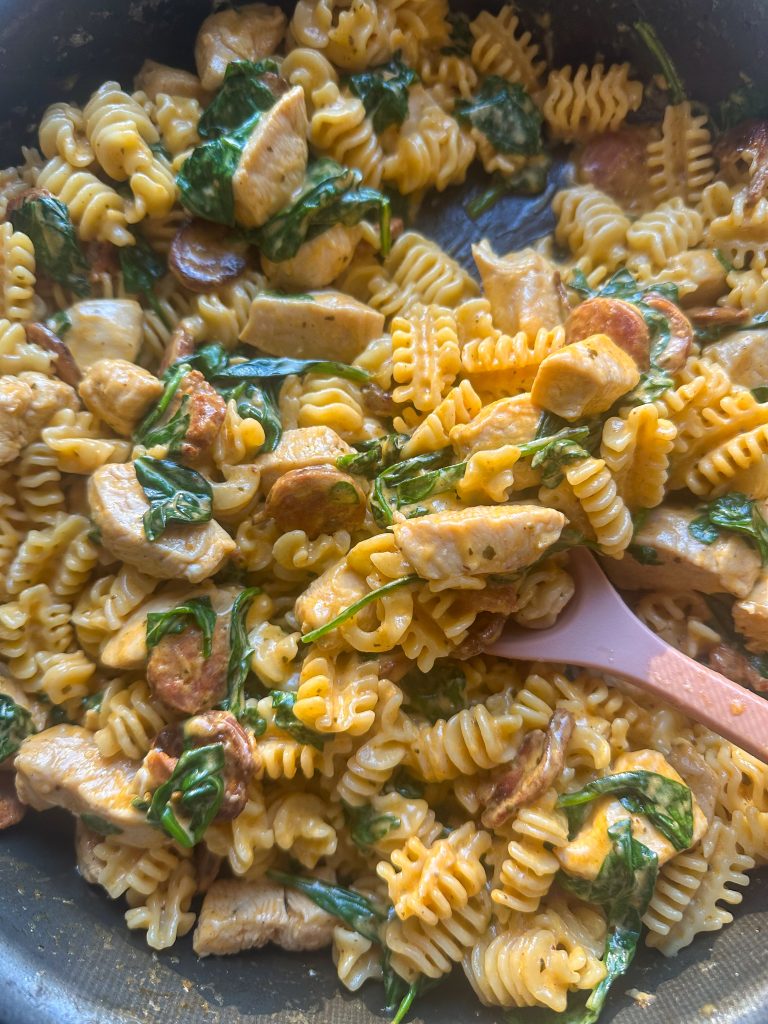 - Once the sauce gets thick, add in your chorizo and chicken and spinach. Cook for additional minute and mix well.