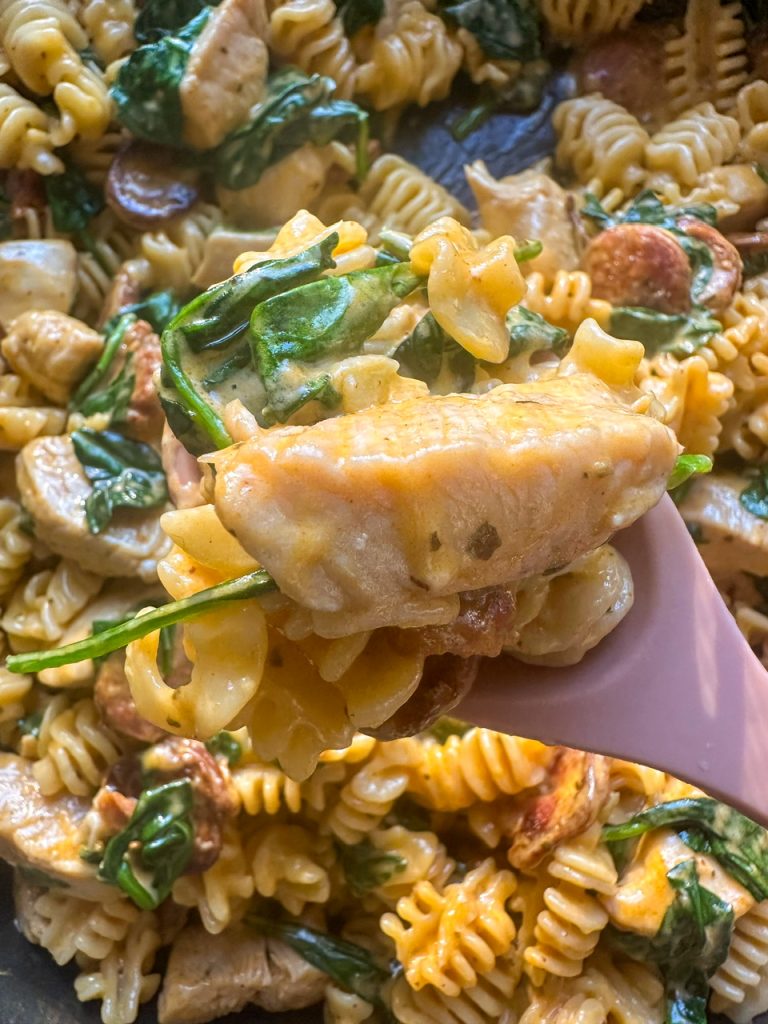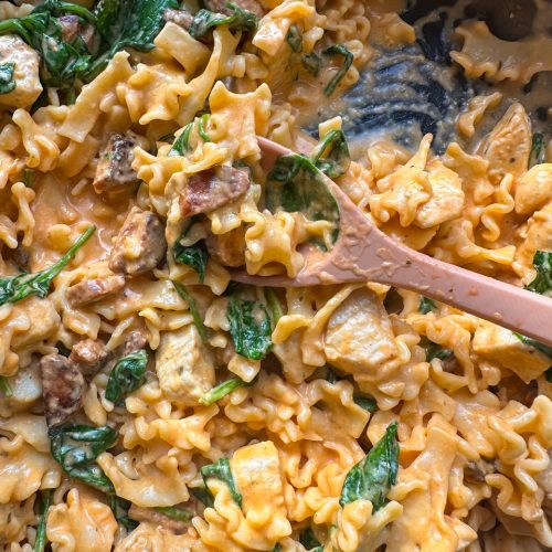 This recipe is so flavorful and takes less than 30 minutes to make. It is the perfect one pot meal for busy weeknights. The creamy sauce goes so well with the pasta, basil flavored chicken, and crispy sausage. This is peak comfort food – perfect for when the weather is starting to get colder and you need something to warm you up.