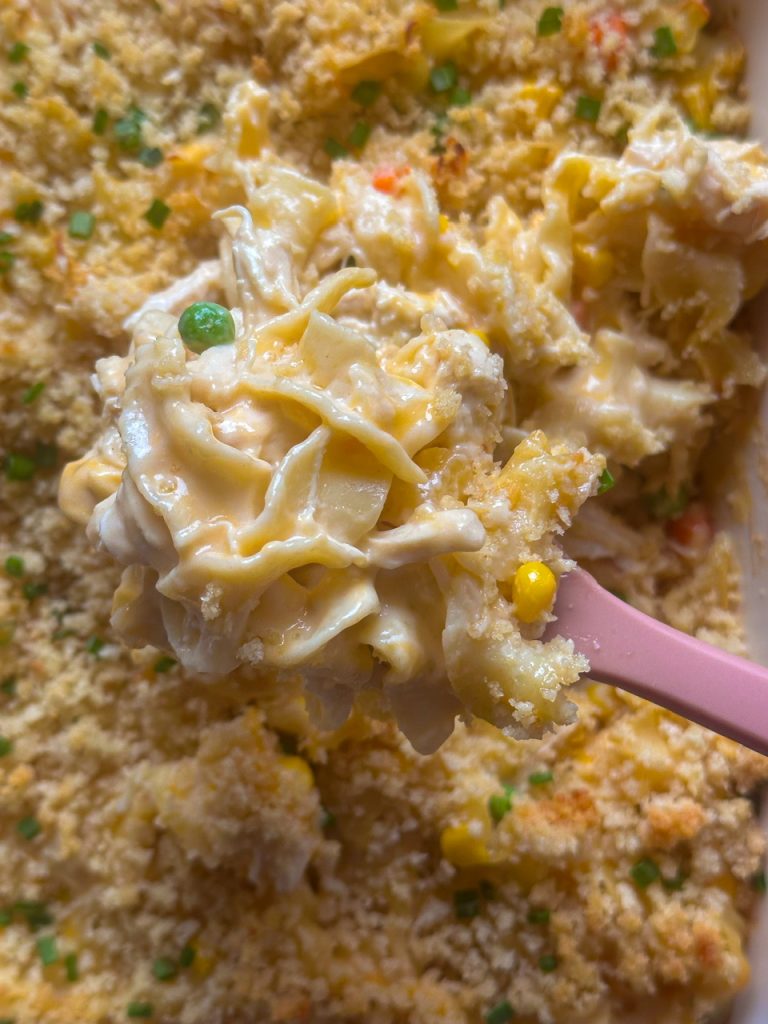 creamy chicken noodle casserole topped with buttery panko breadcrumbs