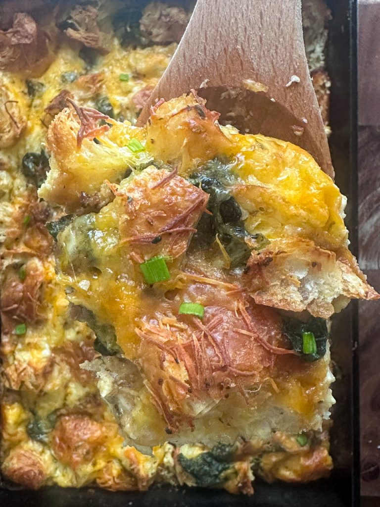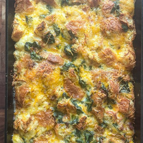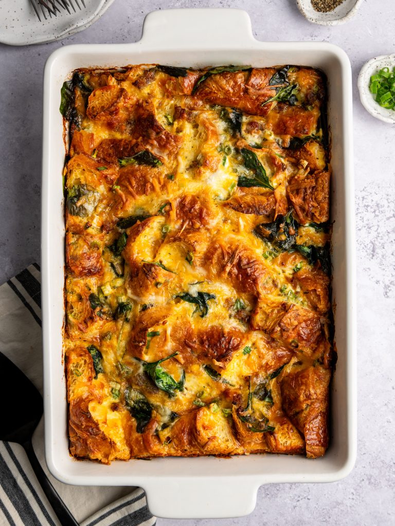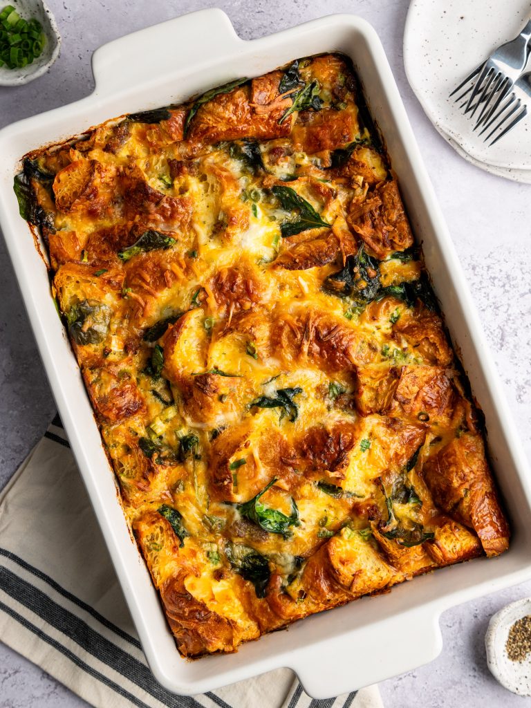 This recipe for croissant breakfast casserole is made with croissants, breakfast sausage, eggs, spinach, herbs, and cheese. I love it because you prepare the dish the night before and then bake it in the morning. The croissants absorb the egg mixture overnight and then when you bake it, it comes out perfectly fluffy with a crispy top. It is perfect for holidays or a lazy Sunday morning.
