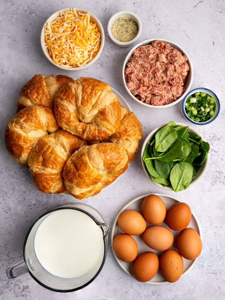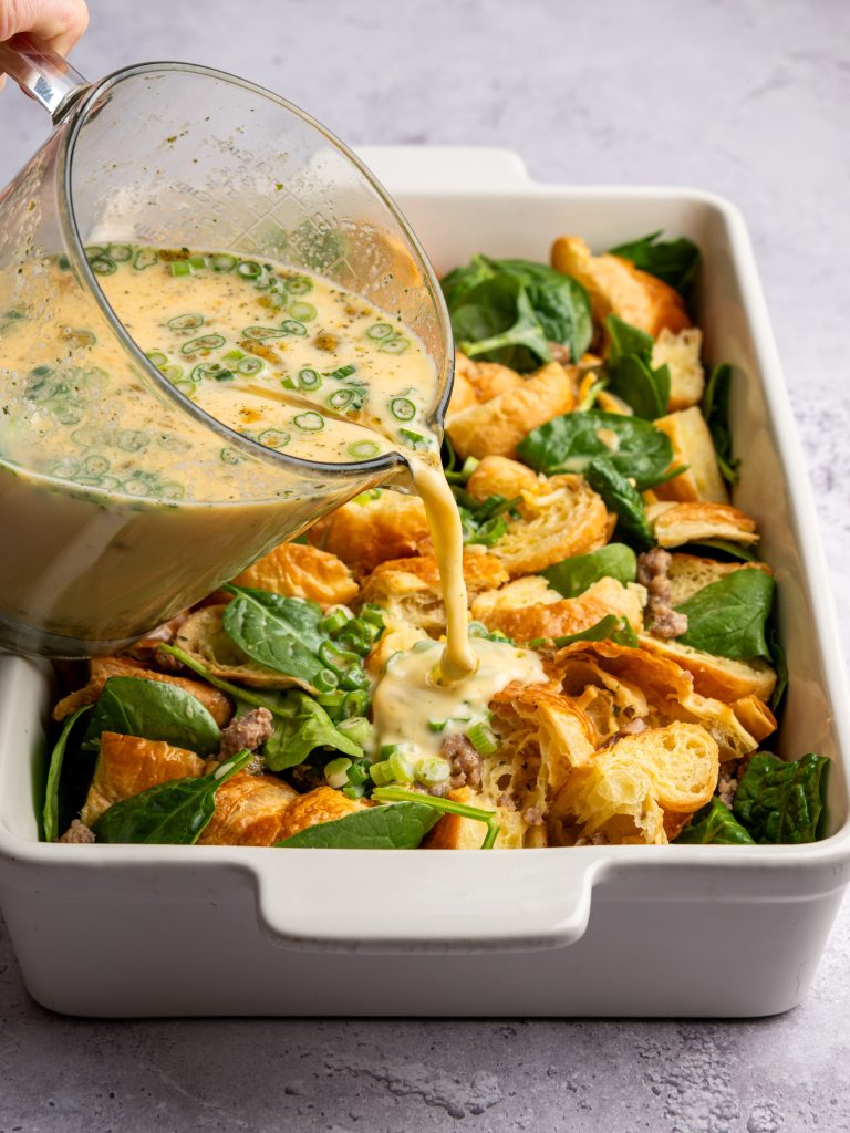 You bake the eggs and milk into the croissants. The croissants absorb the egg mixture and it gets all fluffy. The flavors of spinach and sausage turn this dish into savory breakfast heaven!