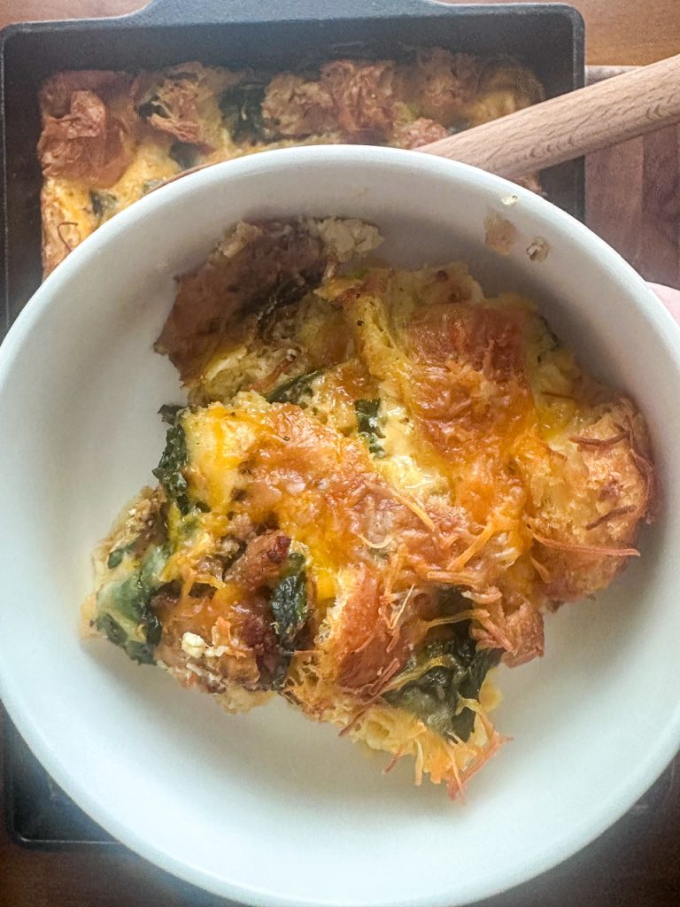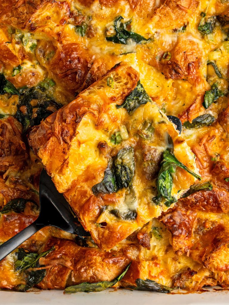 This recipe for croissant breakfast casserole is made with croissants, breakfast sausage, eggs, spinach, herbs, and cheese. I love it because you prepare the dish the night before and then bake it in the morning. The croissants absorb the egg mixture overnight and then when you bake it, it comes out perfectly fluffy with a crispy top. It is perfect for holidays or a lazy Sunday morning.