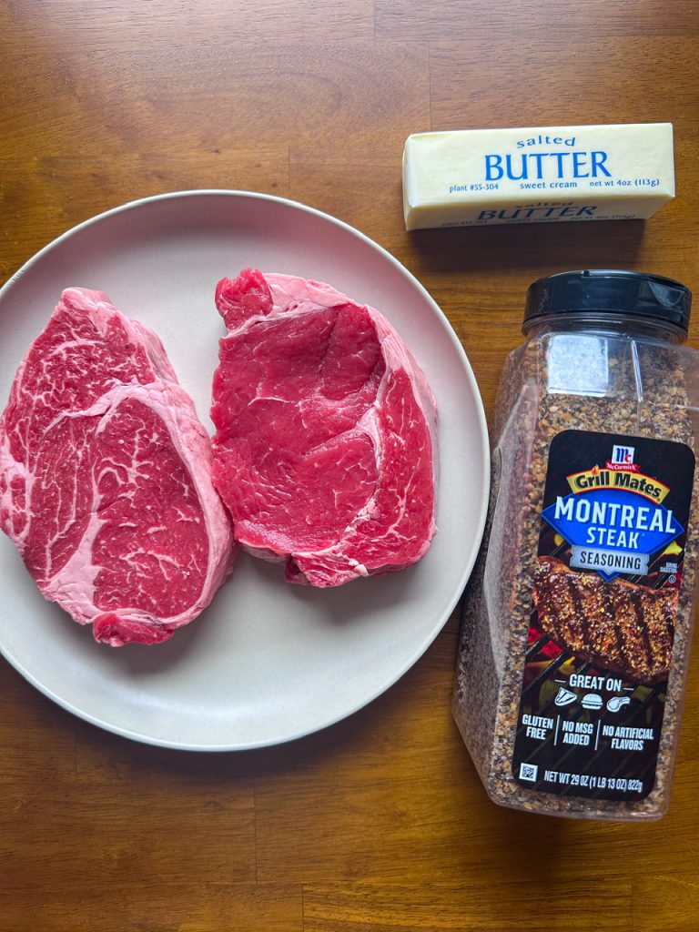 - Drizzle olive oil on both sides of the steaks and evenly distribute the seasoning.2 boneless ribeye steak, 1 tbsp olive oil, 1.5 tbsp montreal steak seasoning