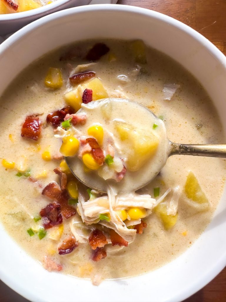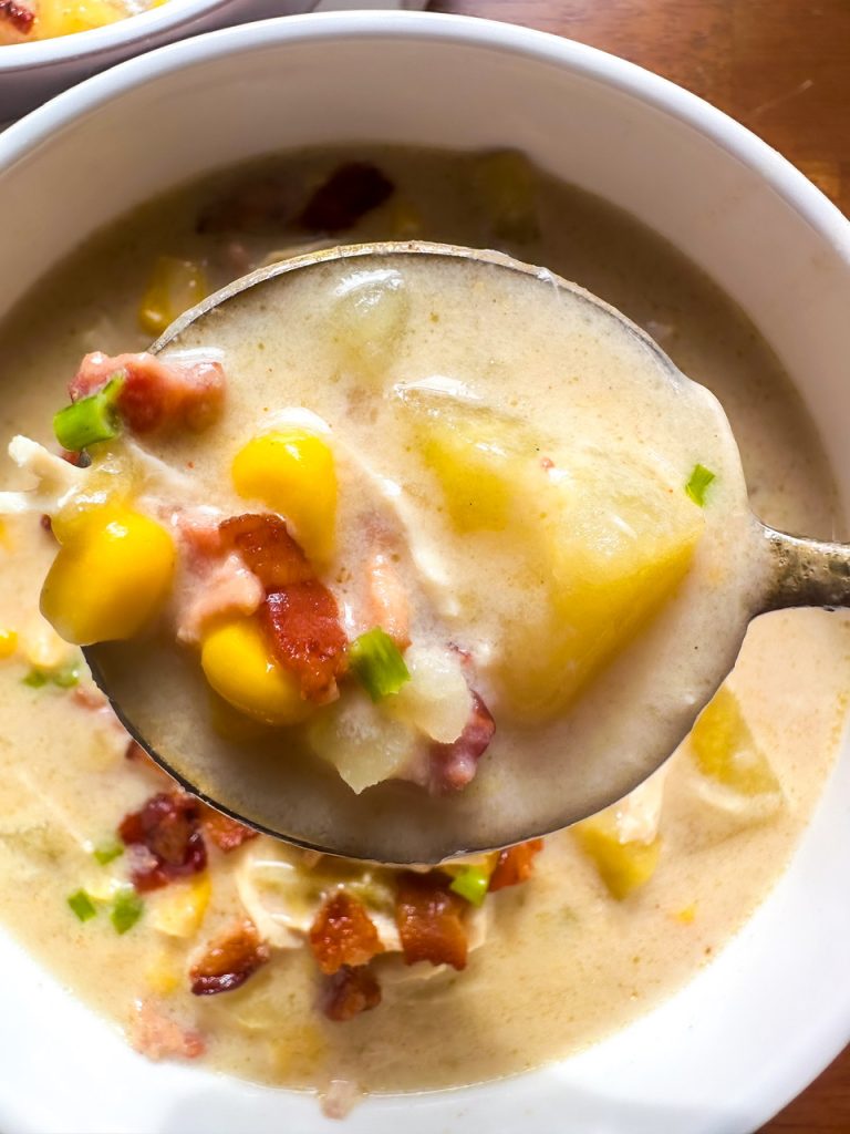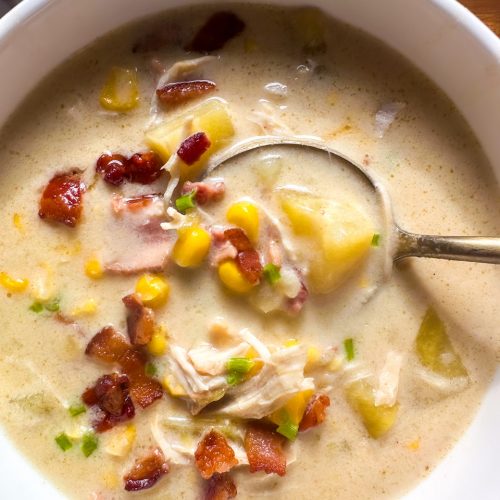 Slow cooker chicken and corn chowder with potatoes and bacon