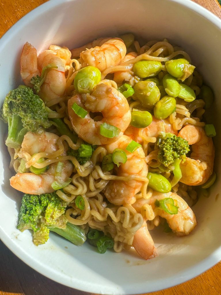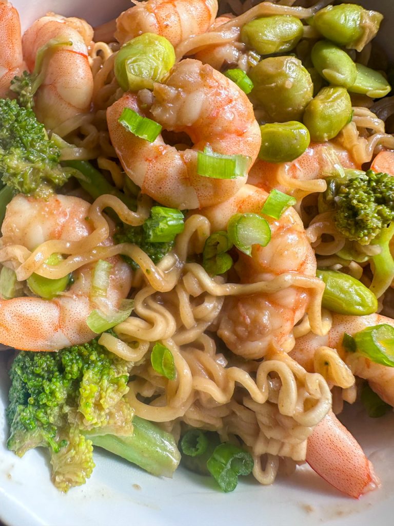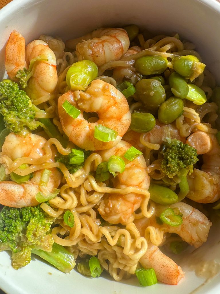 Shrimp and Ramen Stir-Fry with broccoli, edamame, and peanut sauce