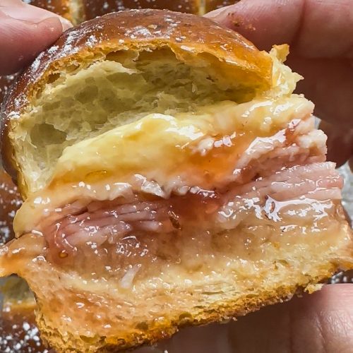 These baked monte cristo sliders are Hawaiian rolls layered with deli sliced ham, deli sliced turkey, strawberry jam, gruyere cheese, and dijon mayonnaise and then baked until the cheese is melted. Then, I top them with a light layer of powdered sugar.