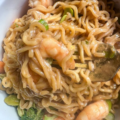 Remove the cover and gently stir the noodles. Add the cooked shrimp and cook for an additional minute or two, making sure everything is covered with the sauce. Once the noodles are completely softened the meal is ready.